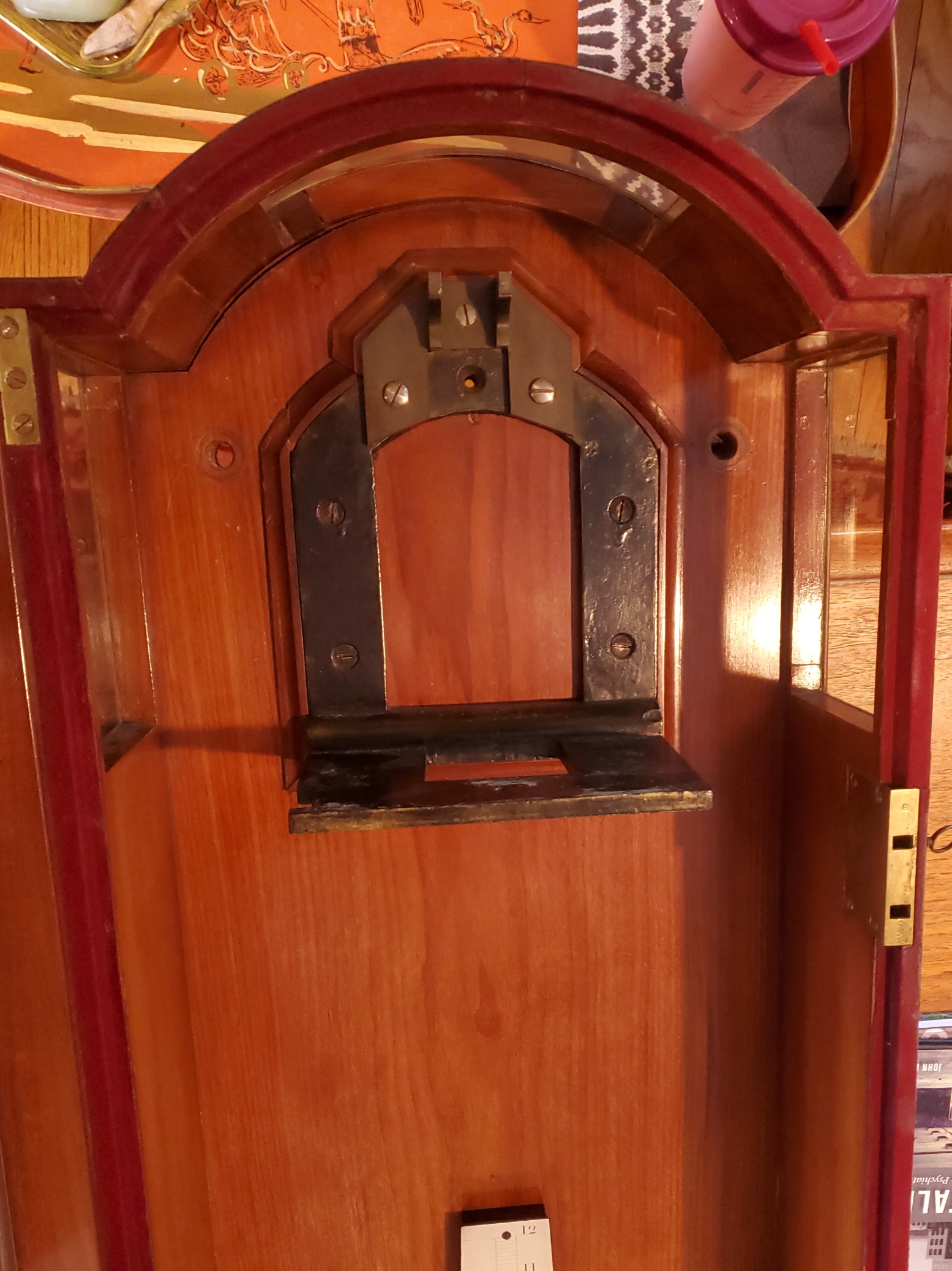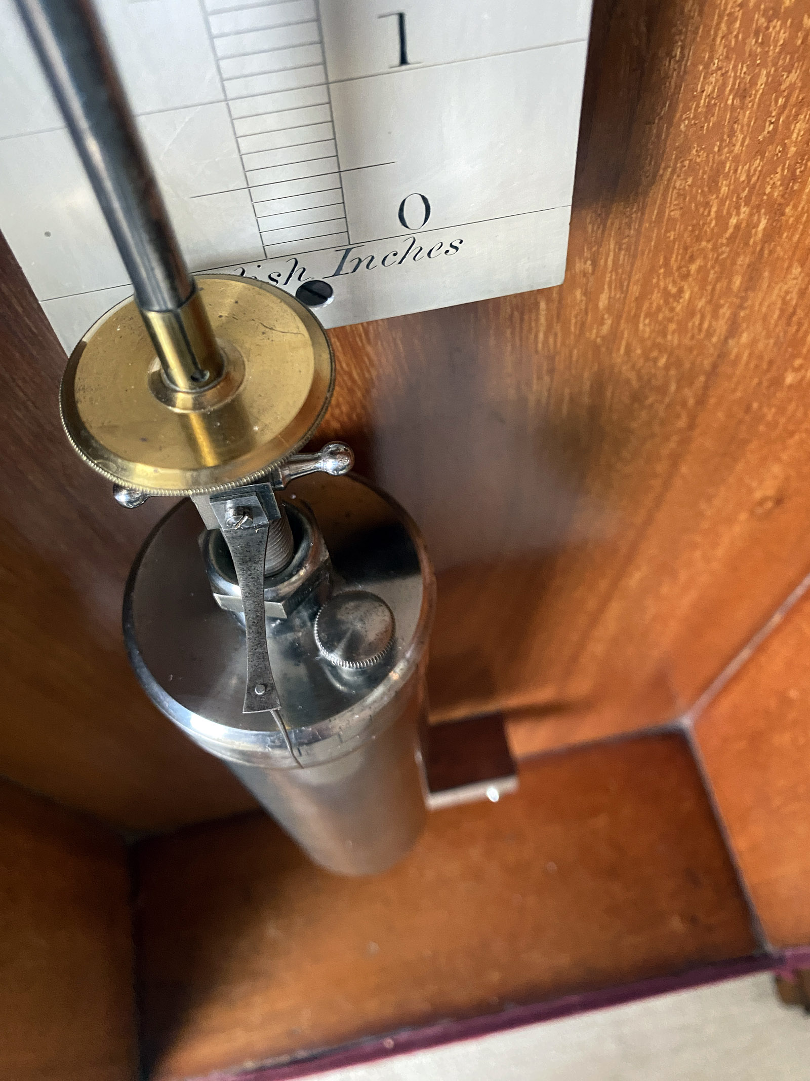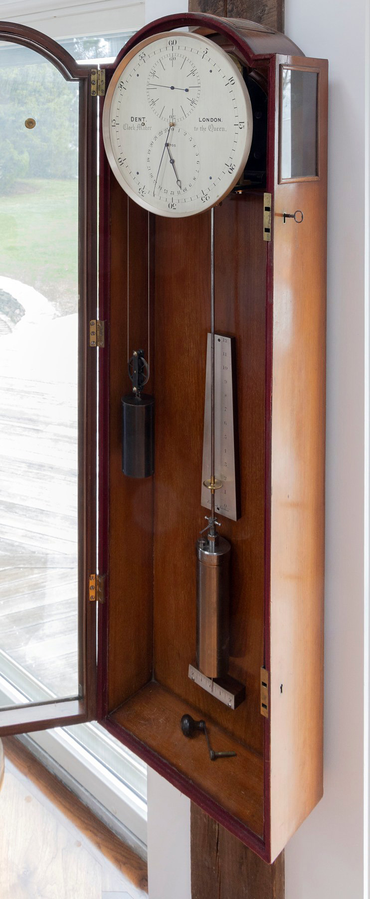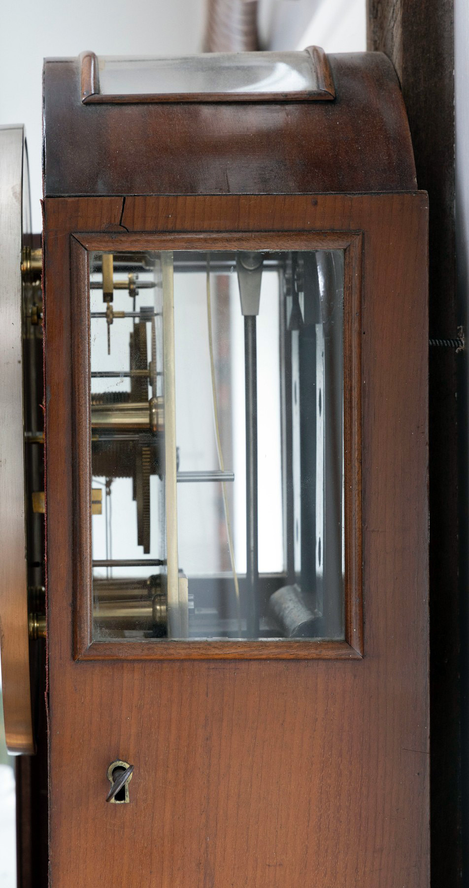 The case has a mahogany shallow break-arch with glazed inspection windows at each side and a dome skylight at the top. The hinge door is double locking and has a felt dust seal. The glazed front door has a brass winding aperture. The backboard has Dent's English Inches and beat scales.