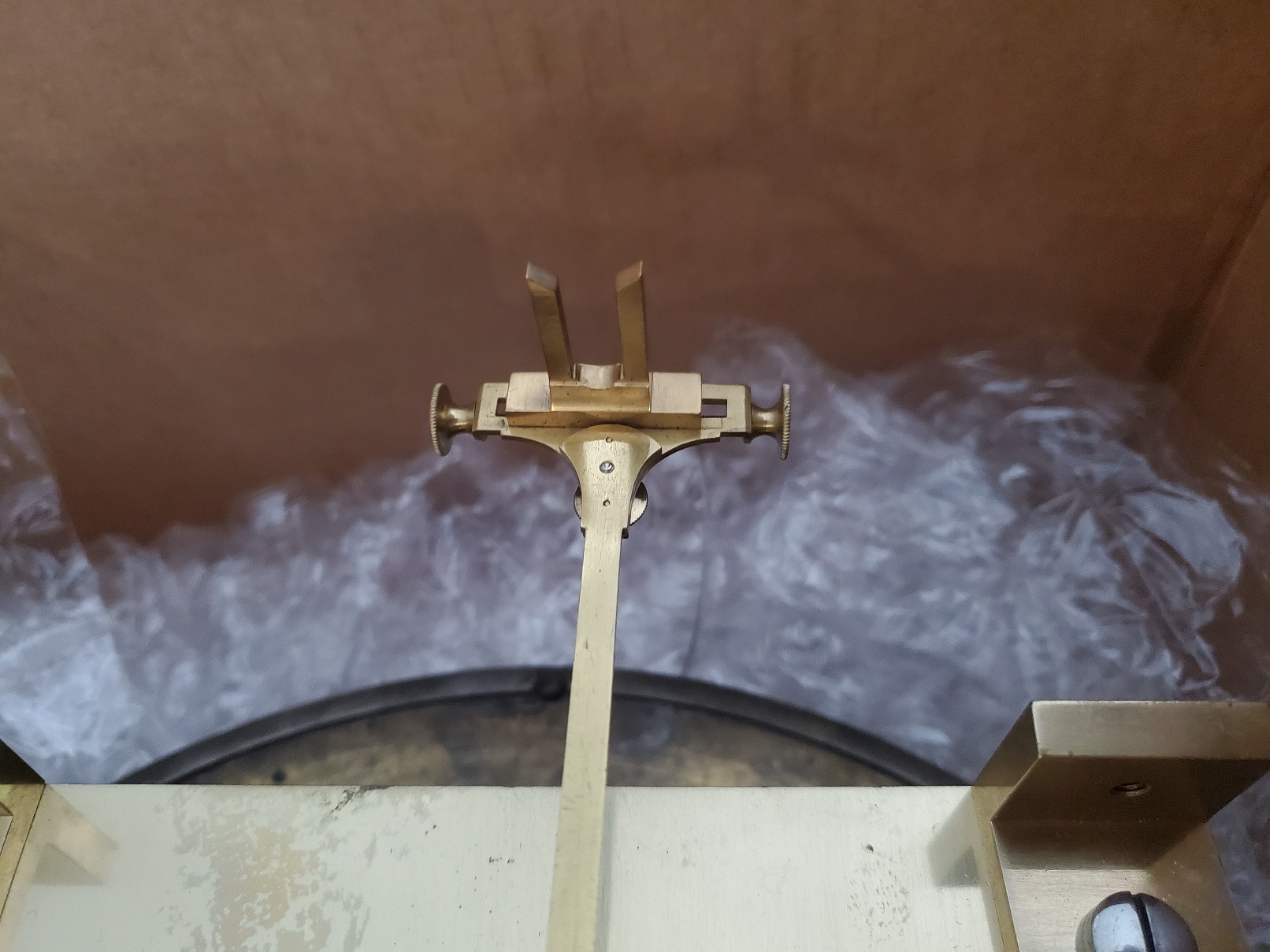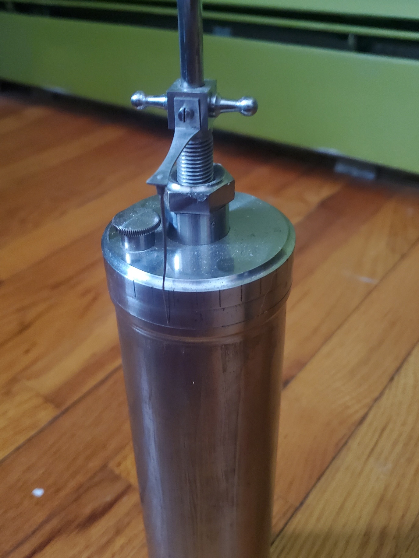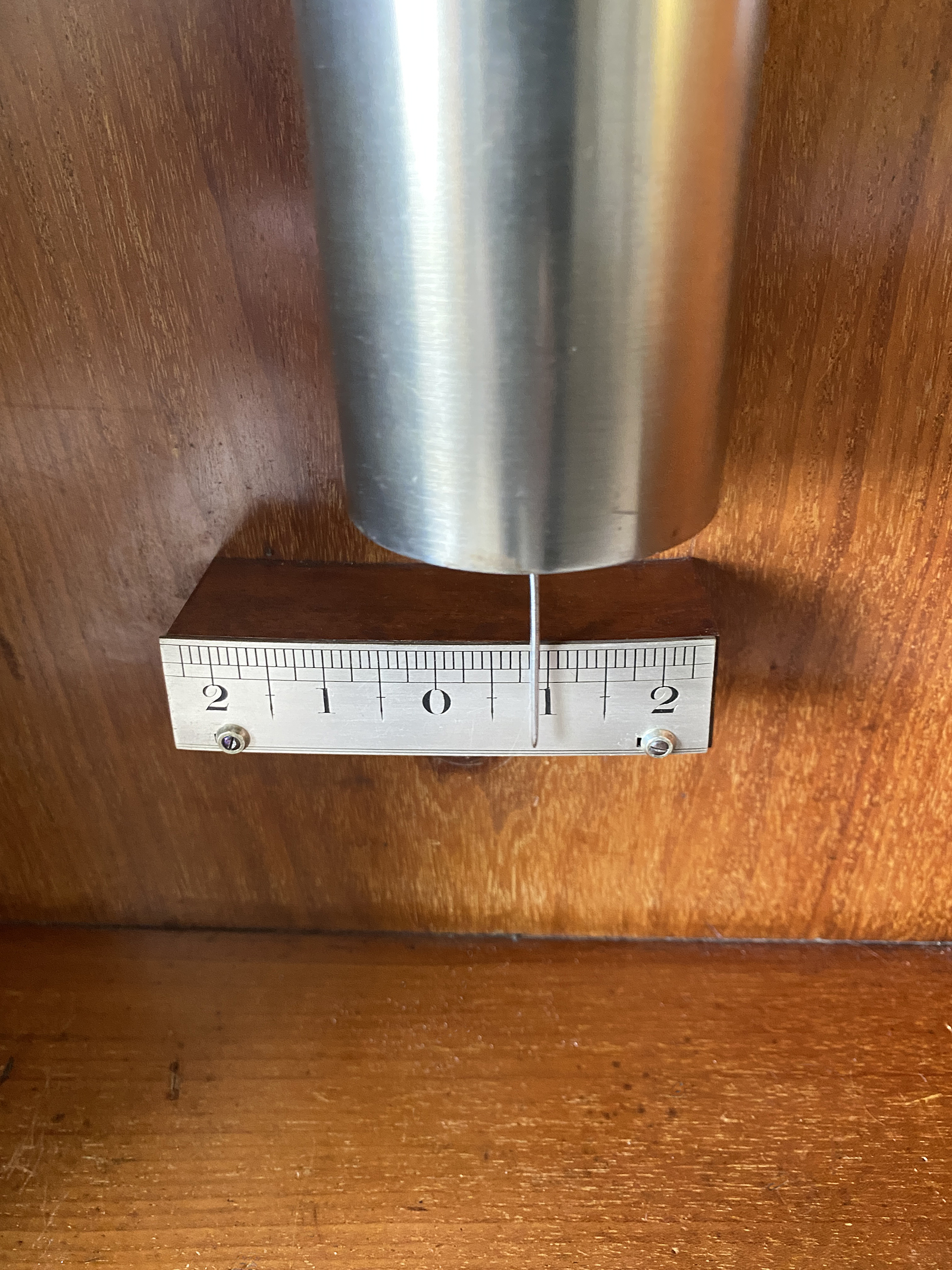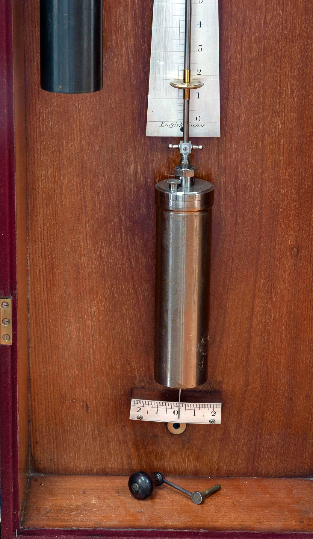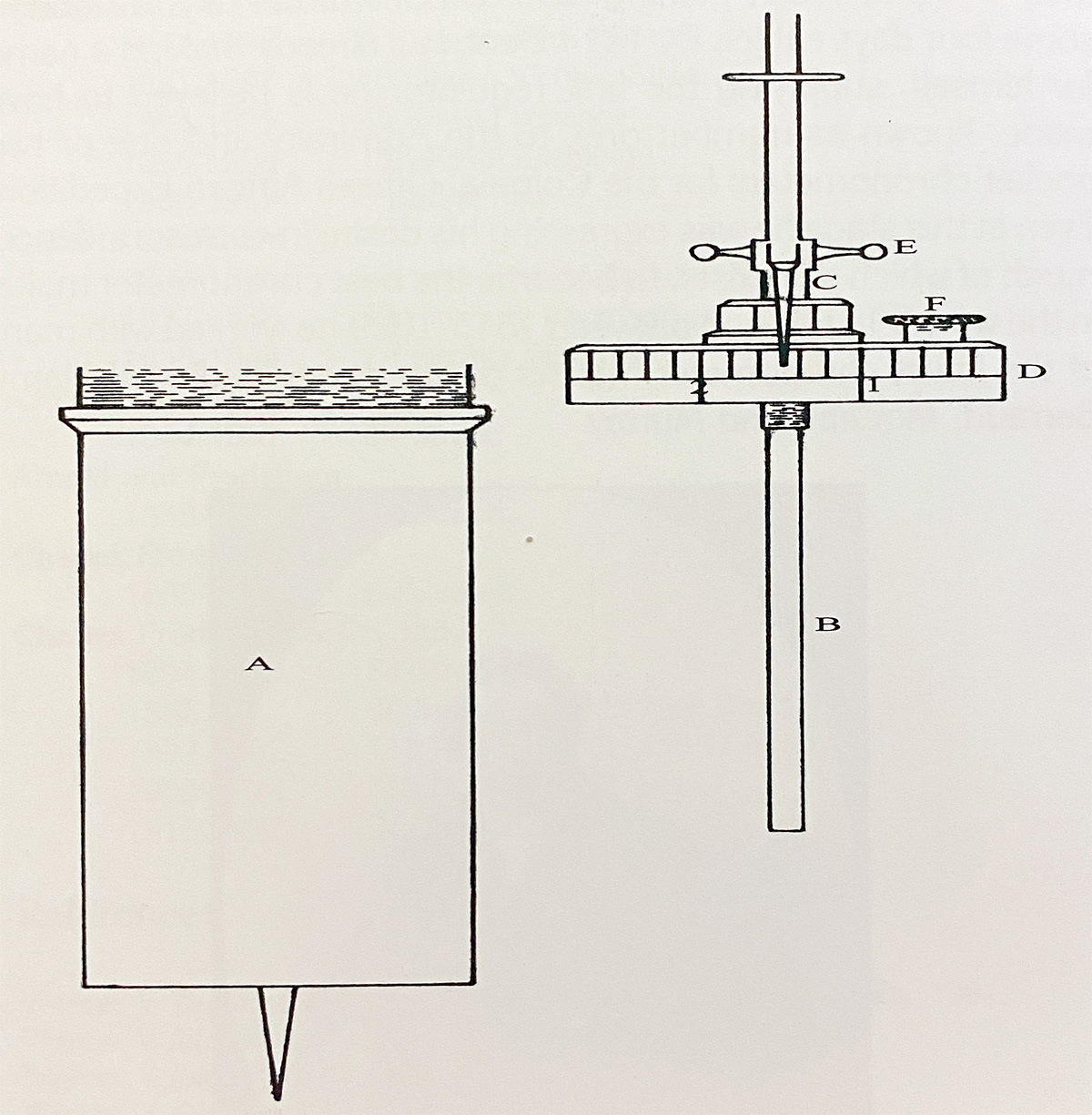 The design of the iron pendulum jar (see photo, below) is simpler than one using glass, regulation being achieved by winding the whole jar (A) plus cap (D) up or down the rod, which passes right through the mercury to aid temperature harmonization. The small screw cap (F) may be used for varying the quantity of mercury and inserting a thermometer; (E) is a hand-hold to be used to protect the suspension when rotating the jar. The divisions around the side of the lid (D) may be calibrated to indicate the change of rate achieved.