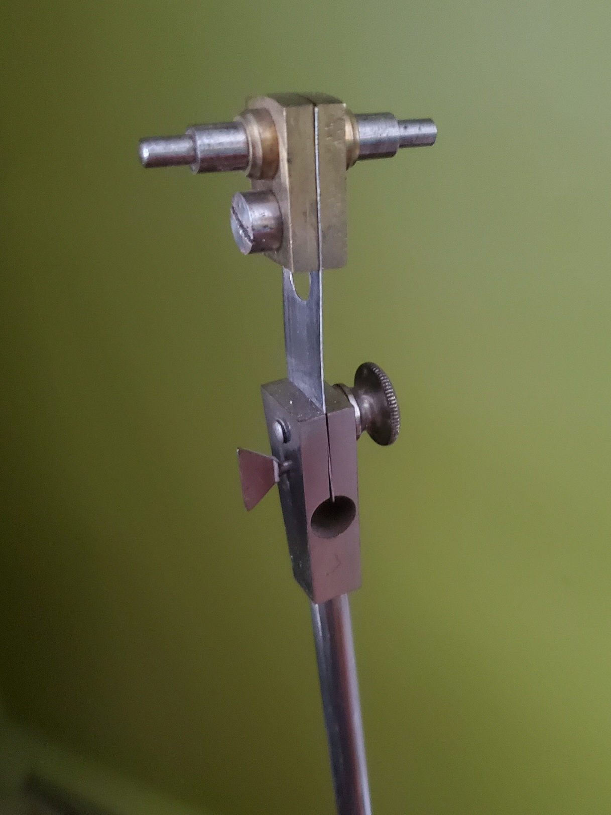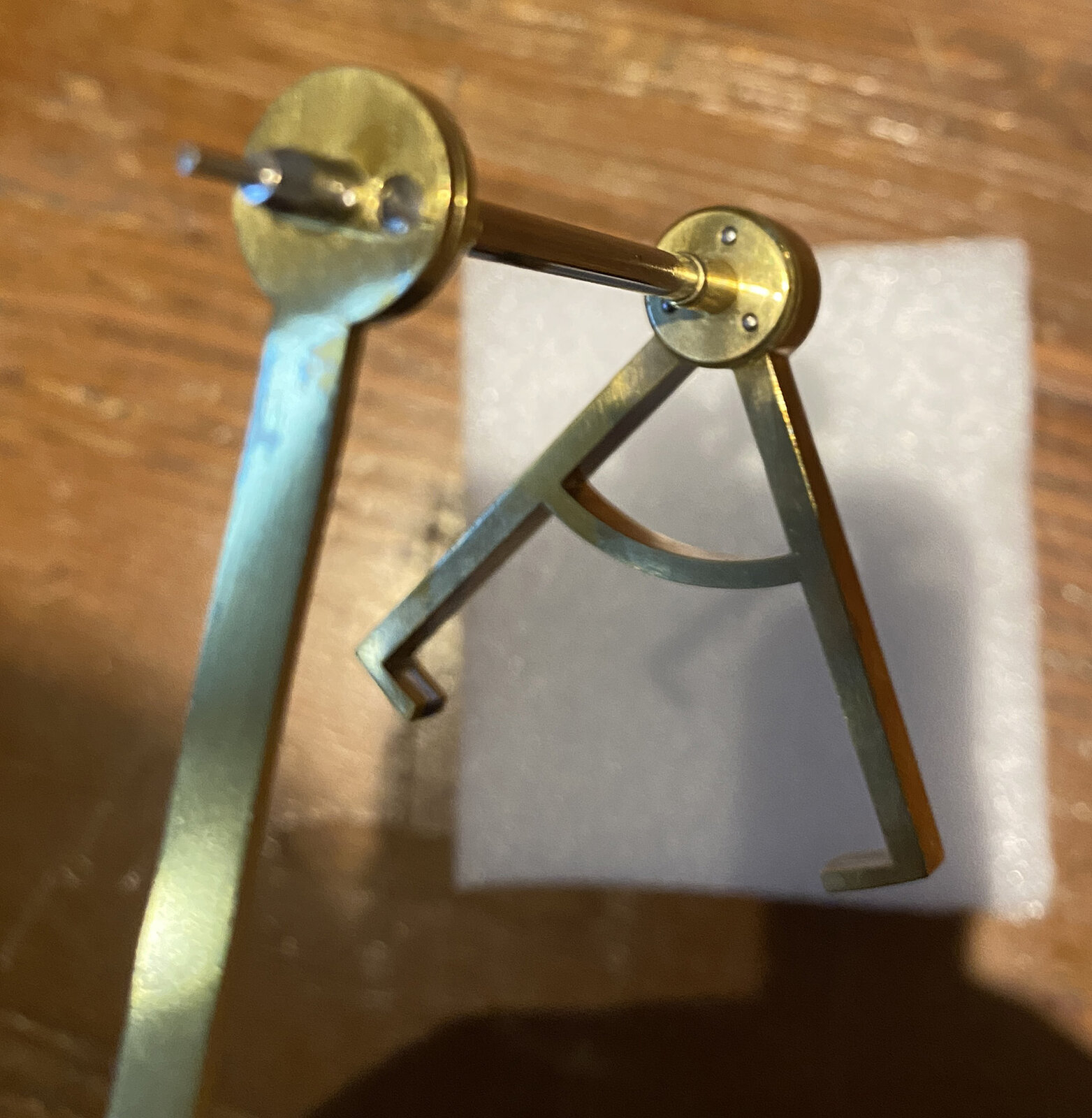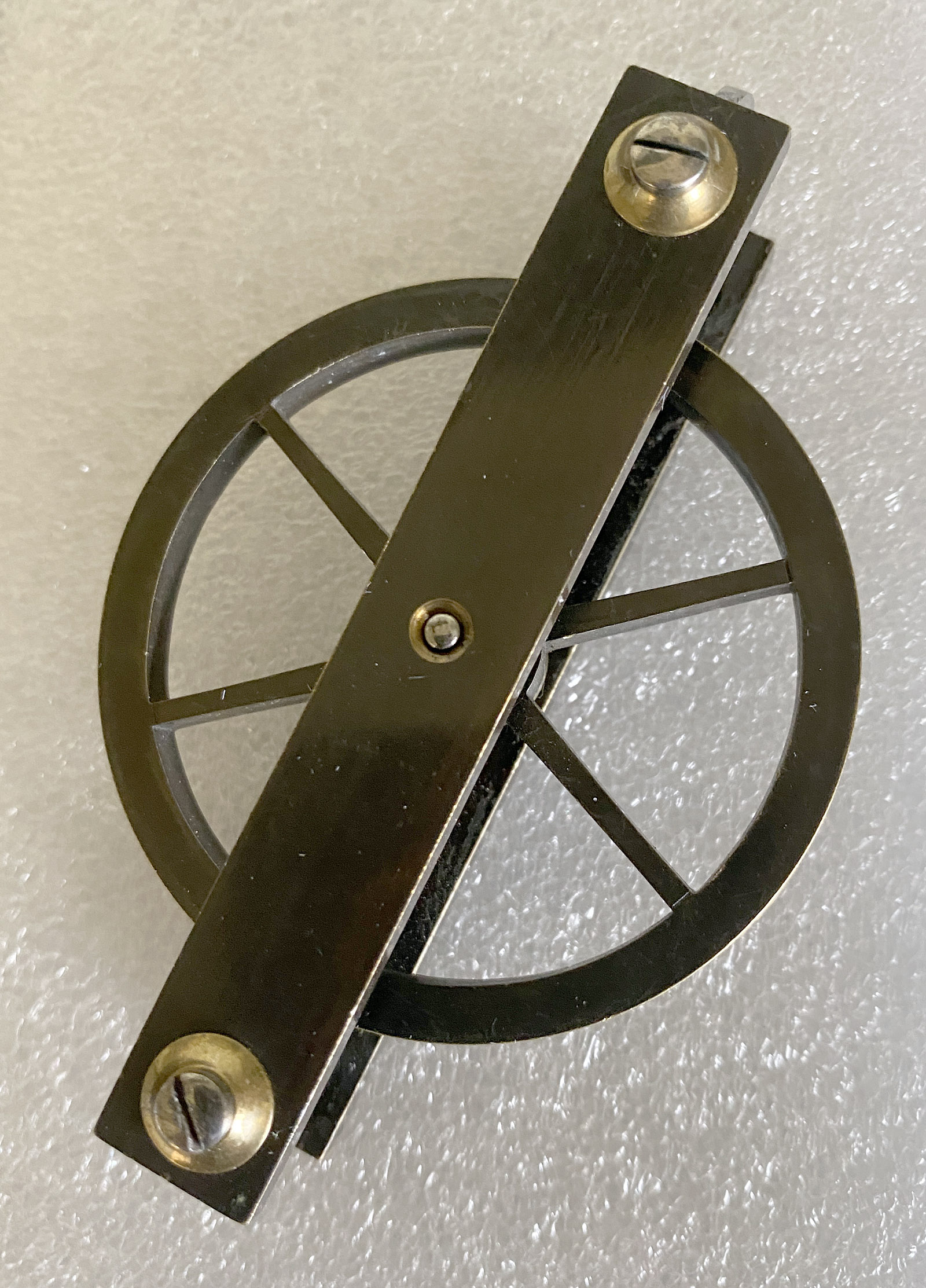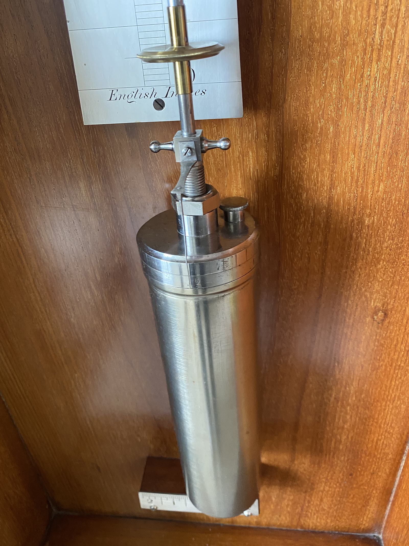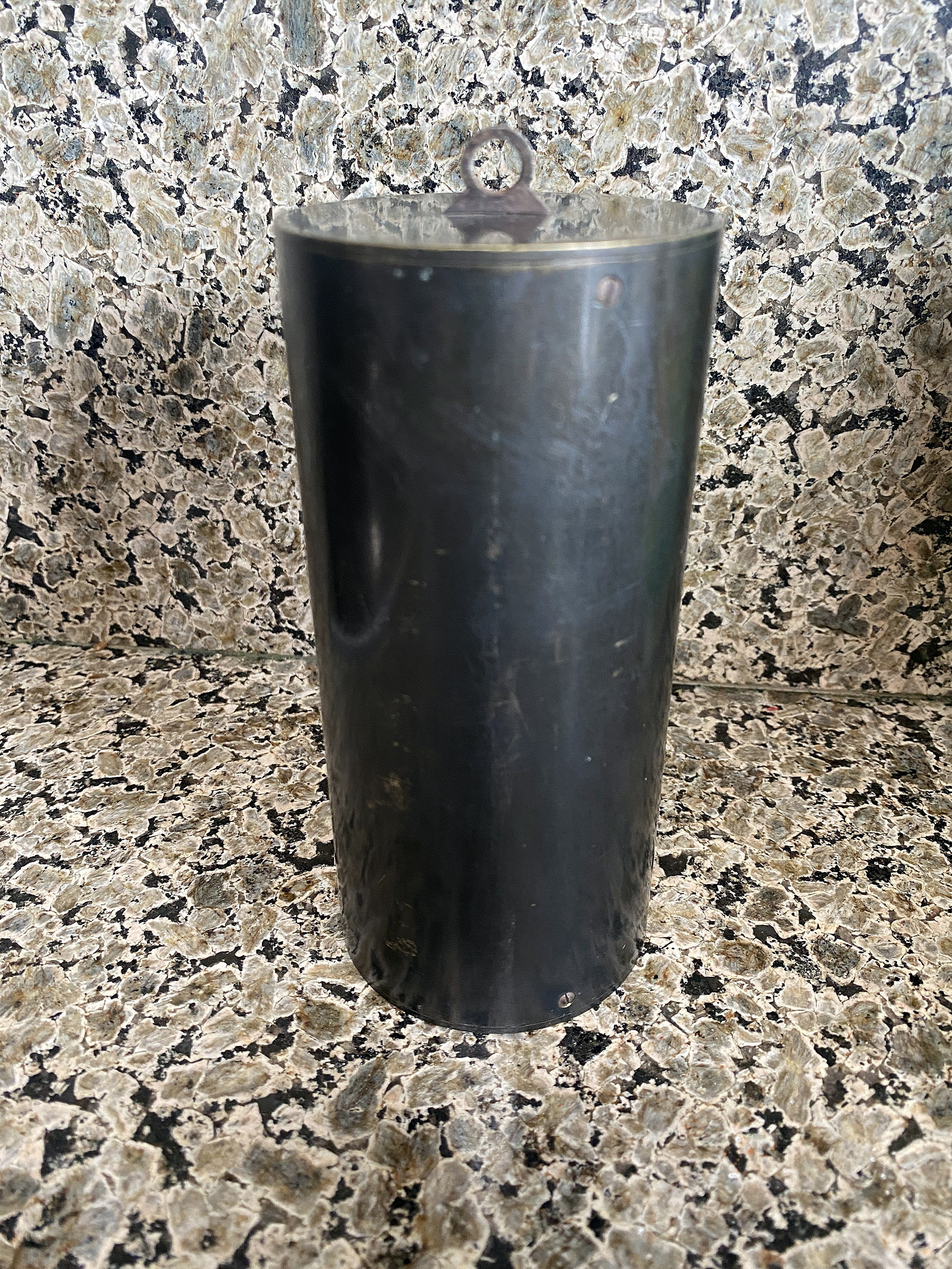 The design of the iron pendulum jar (see photo, below) is simpler than one using glass, regulation being achieved by winding the whole jar (A) plus cap (D) up or down the rod, which passes right through the mercury to aid temperature harmonization. The small screw cap (F) may be used for varying the quantity of mercury and inserting a thermometer; (E) is a hand-hold to be used to protect the suspension when rotating the jar. The divisions around the side of the lid (D) may be calibrated to indicate the change of rate achieved.