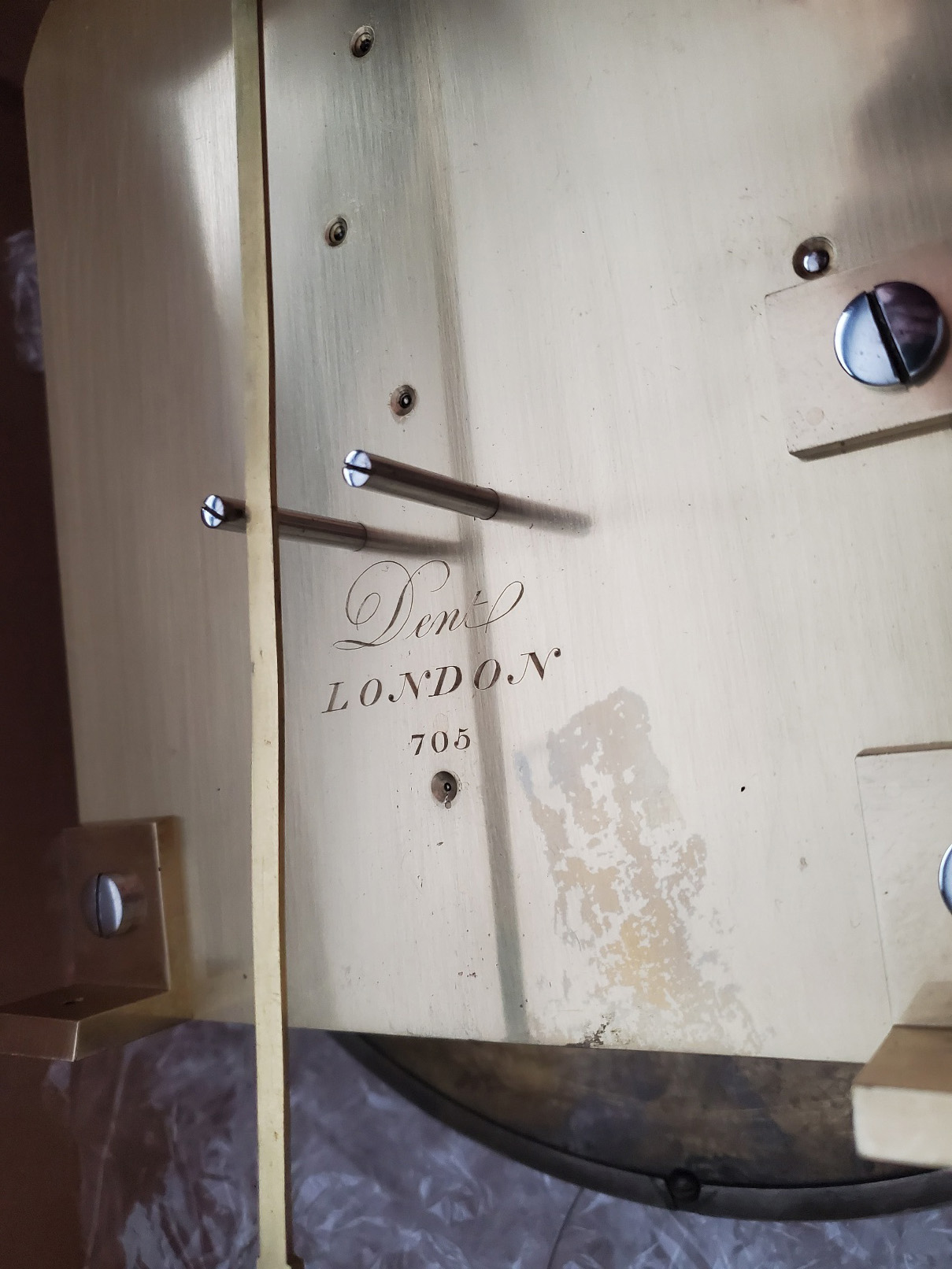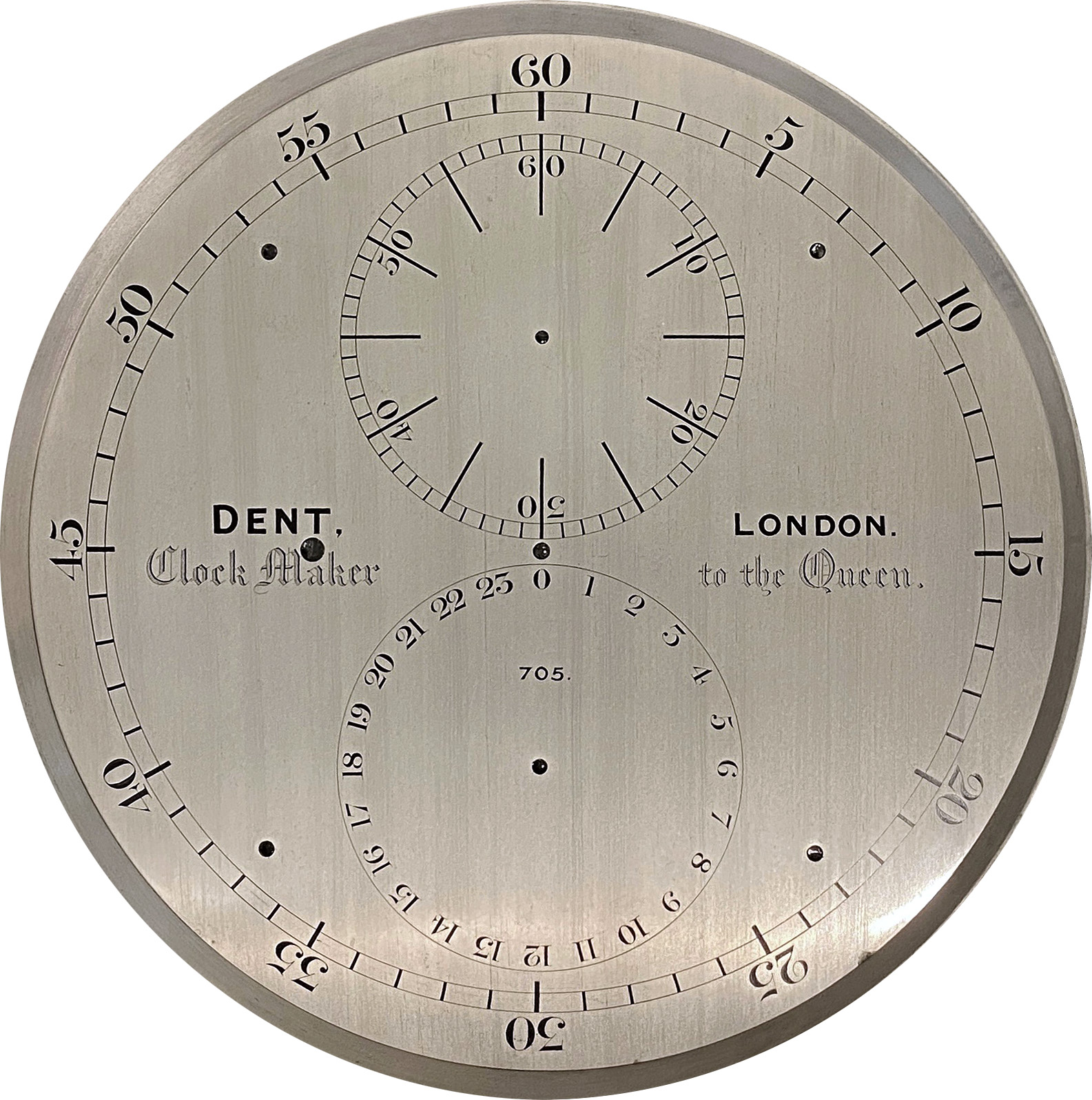 Vaudrey Mercer's book on Dent indicates that regulators 517 to 1503 were made between 1840-53... which puts #705 at c1843. Dimensions: Height 53 inches; Width 15 inches; Depth 8 1/2 inches.