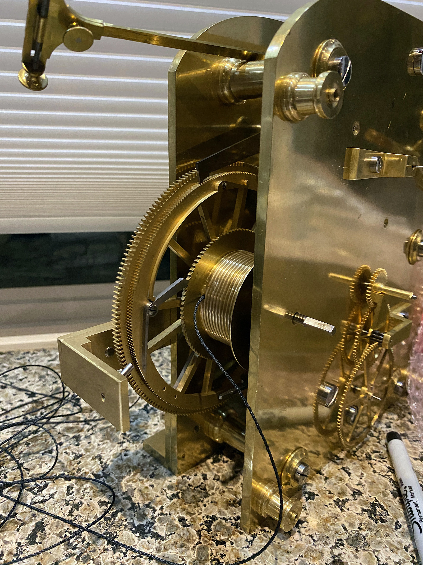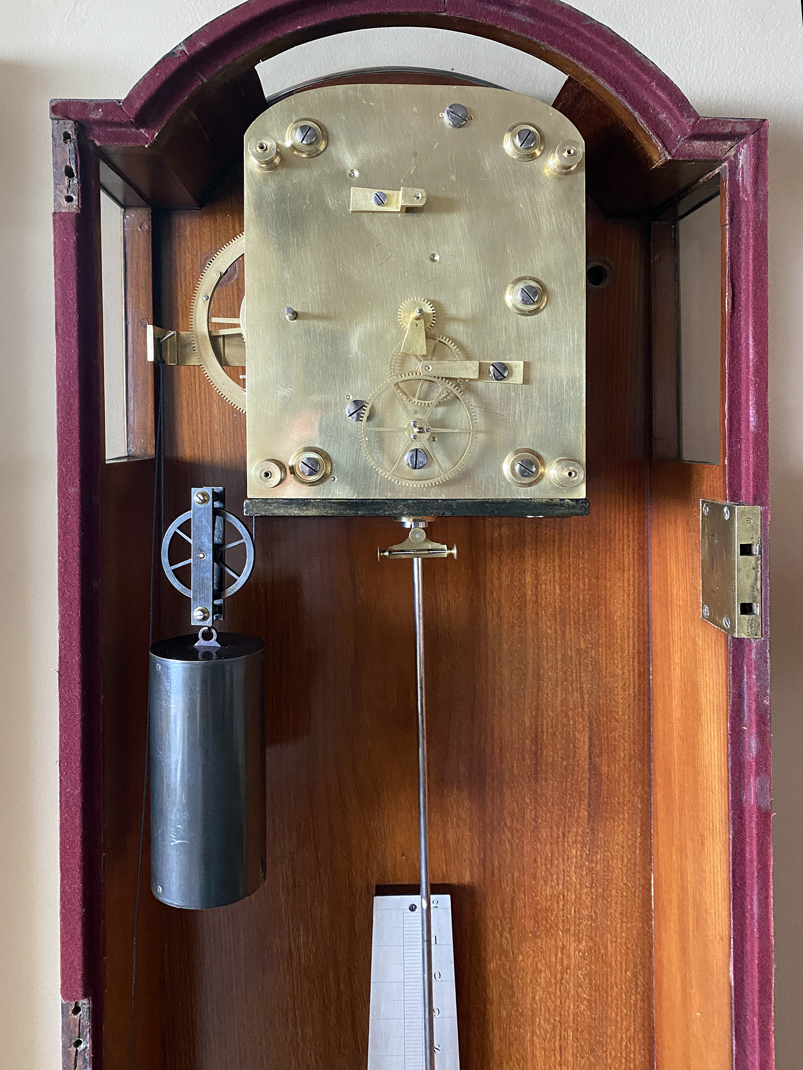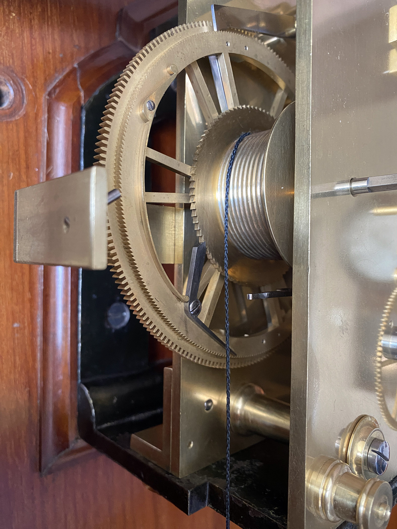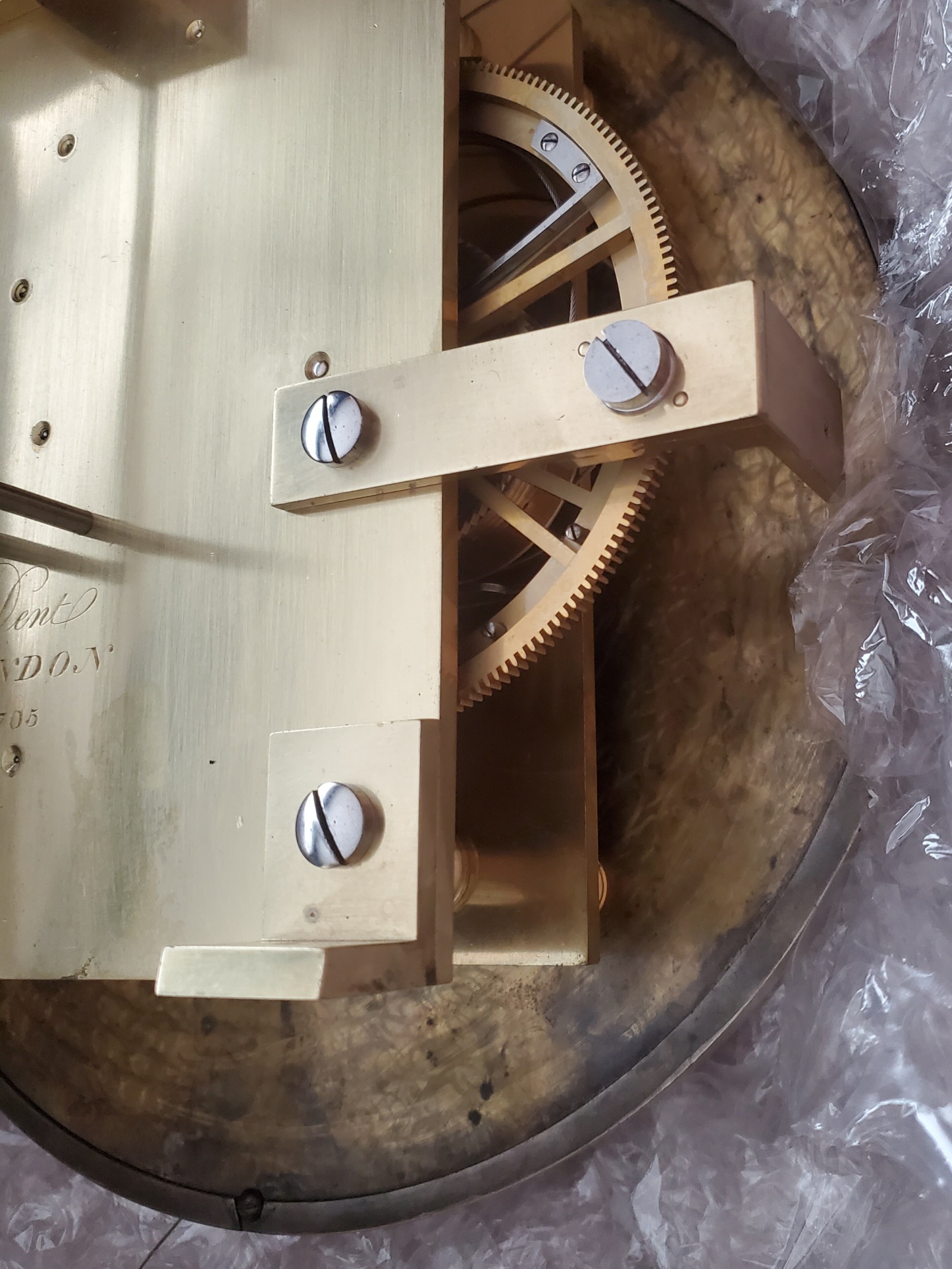 The movement has five pillars. It is signed and numbered on the back-plate and has a dead beat escapement with jeweled pallets, Harrison's maintaining power, high pinion count with six-spoke wheel crossings and counter balanced minute hand.