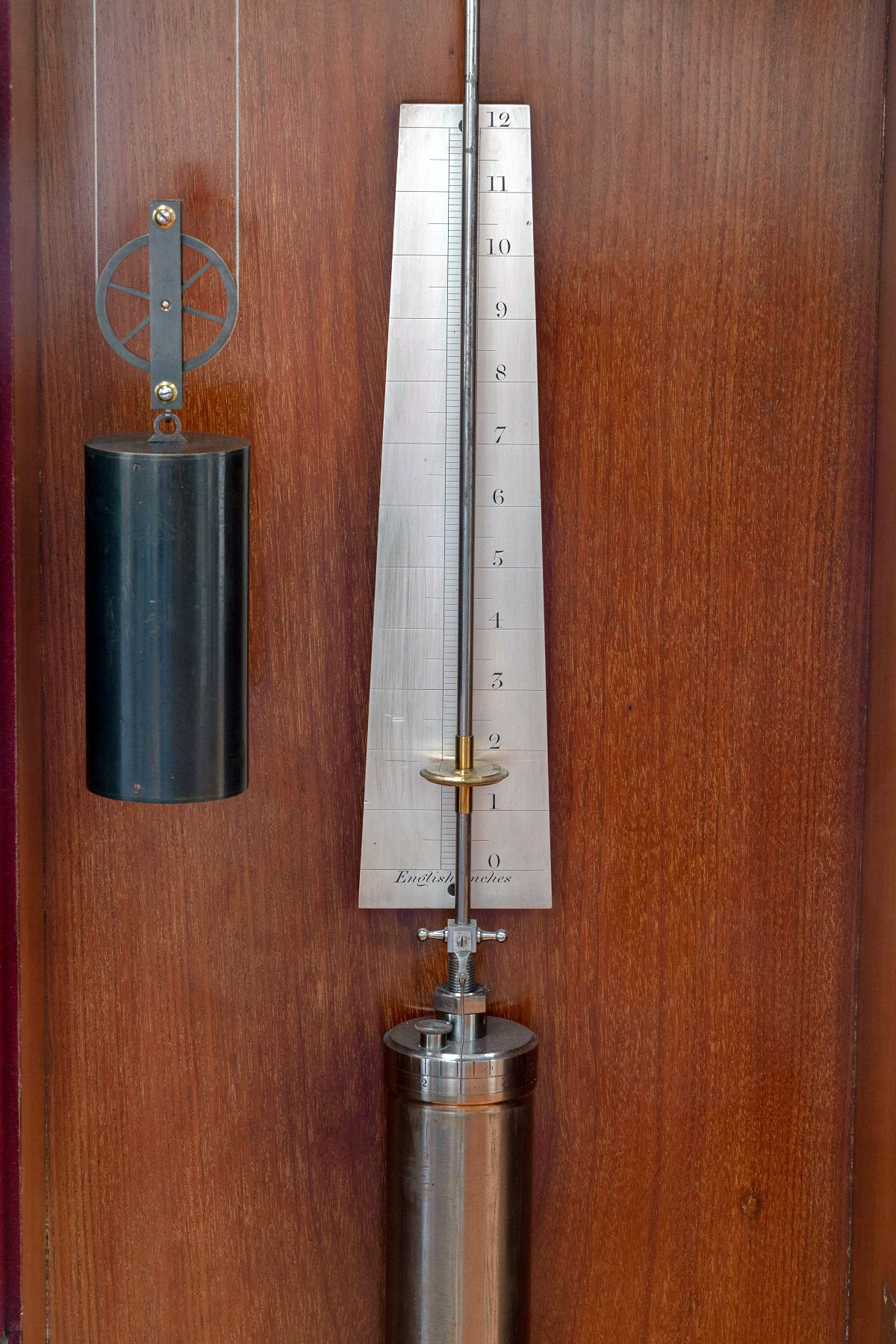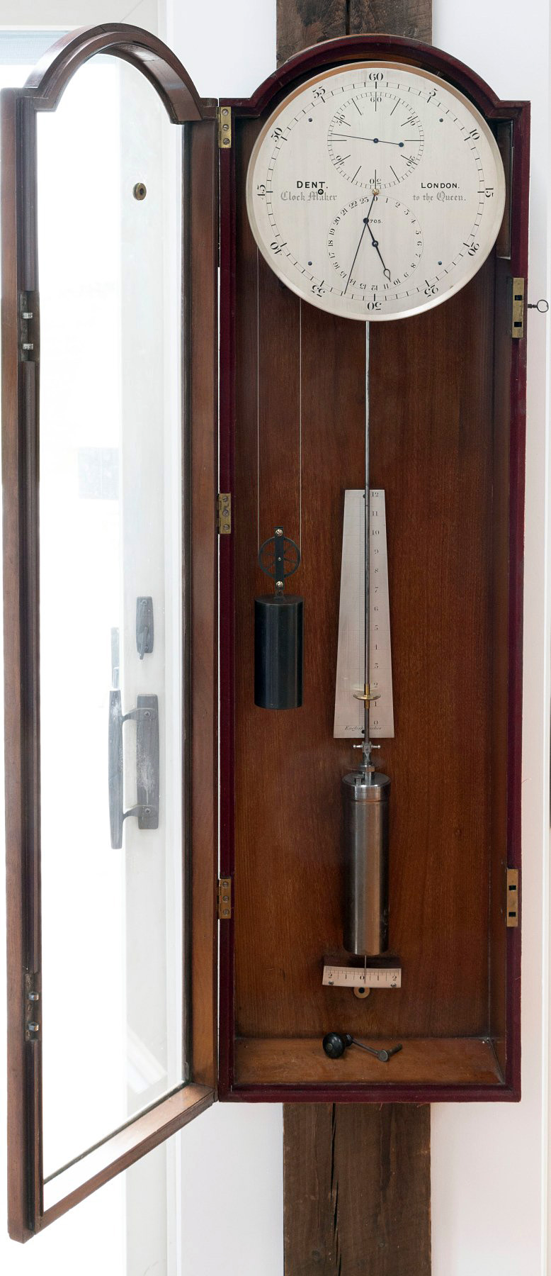 The clock retains its original bronze six point pulley and weight, Dent steel pendulum with mercury-filled polished cast iron jar with fine graduated rating and timing tray on the rod, original (matching numbered) key.